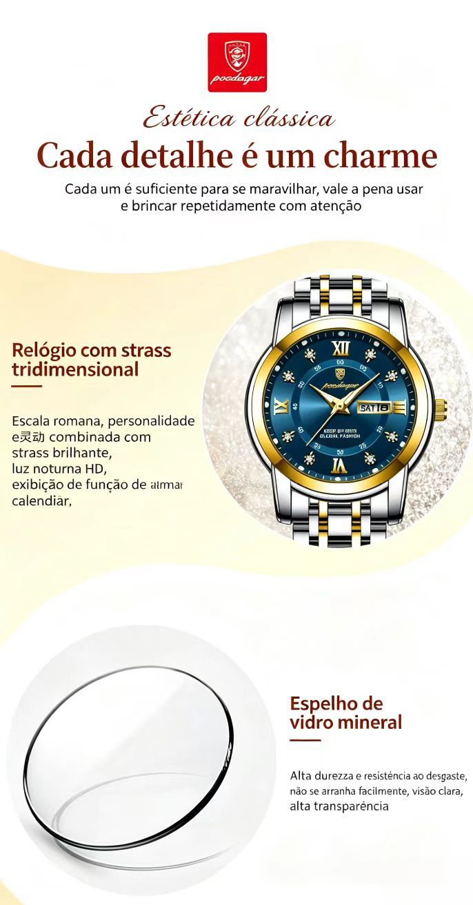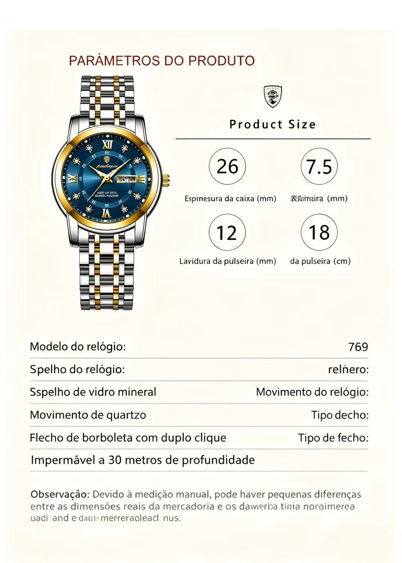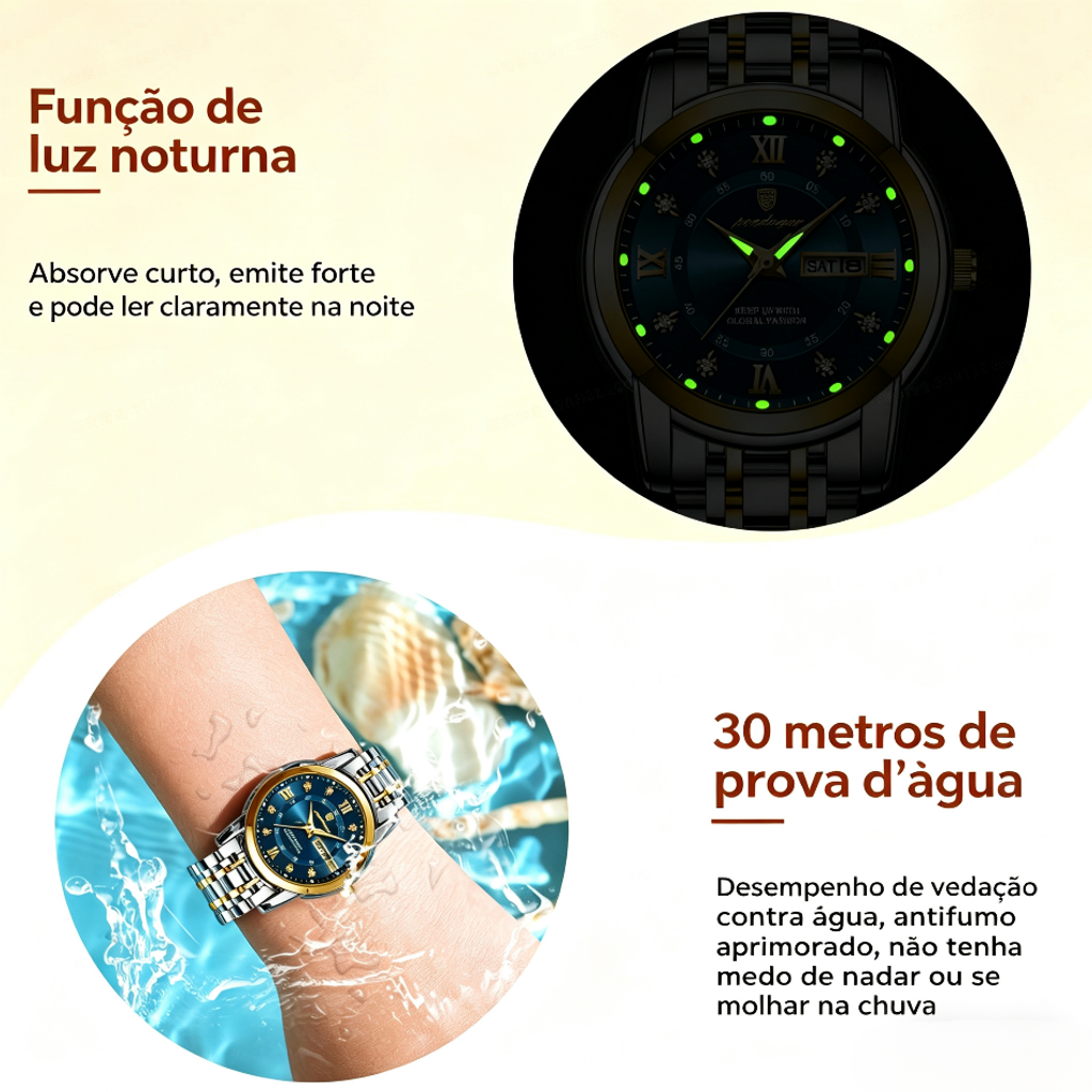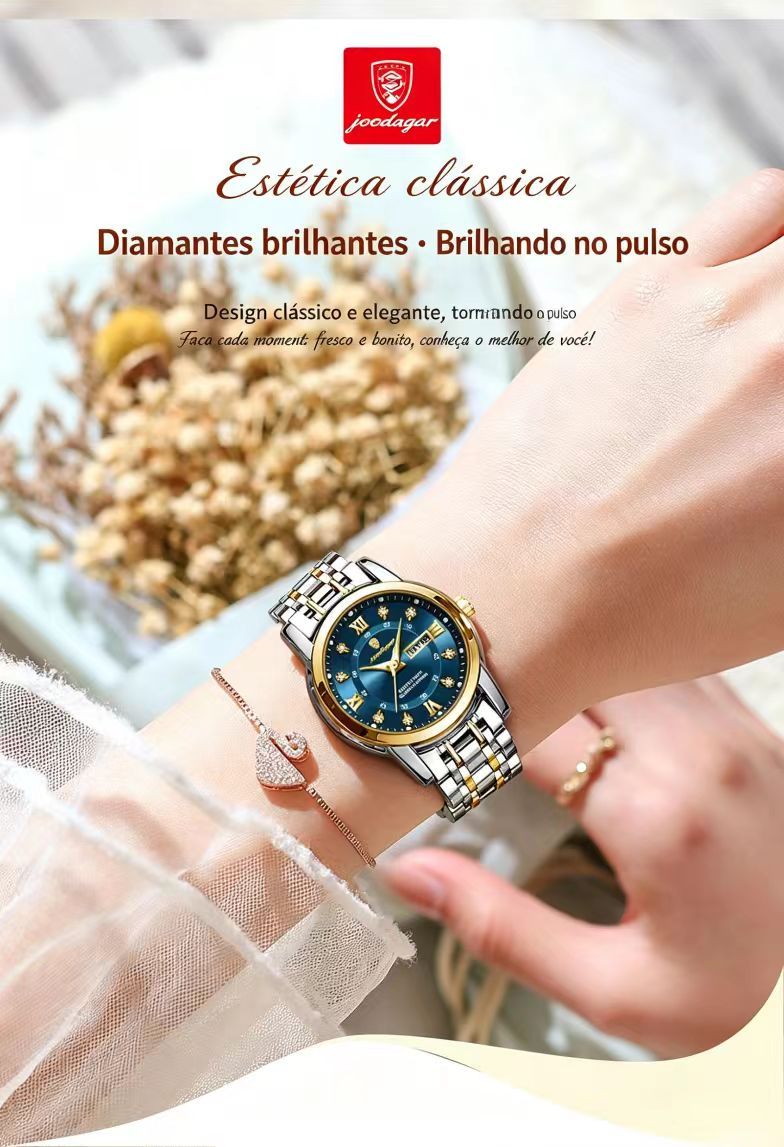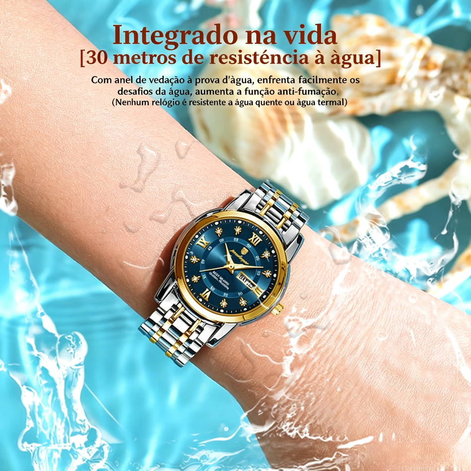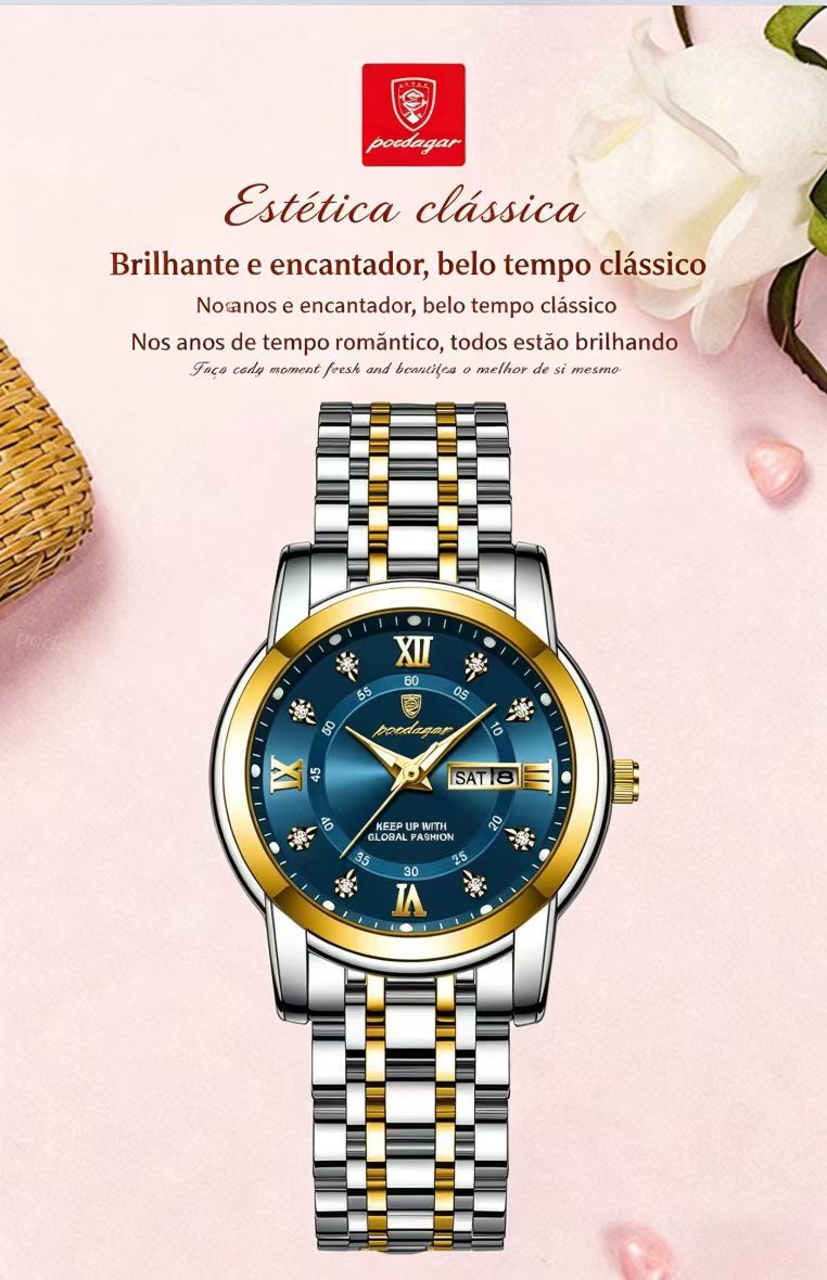 Relógio feminino de marca suíça novo modelo impermeável com luz noturna e duplo calendário